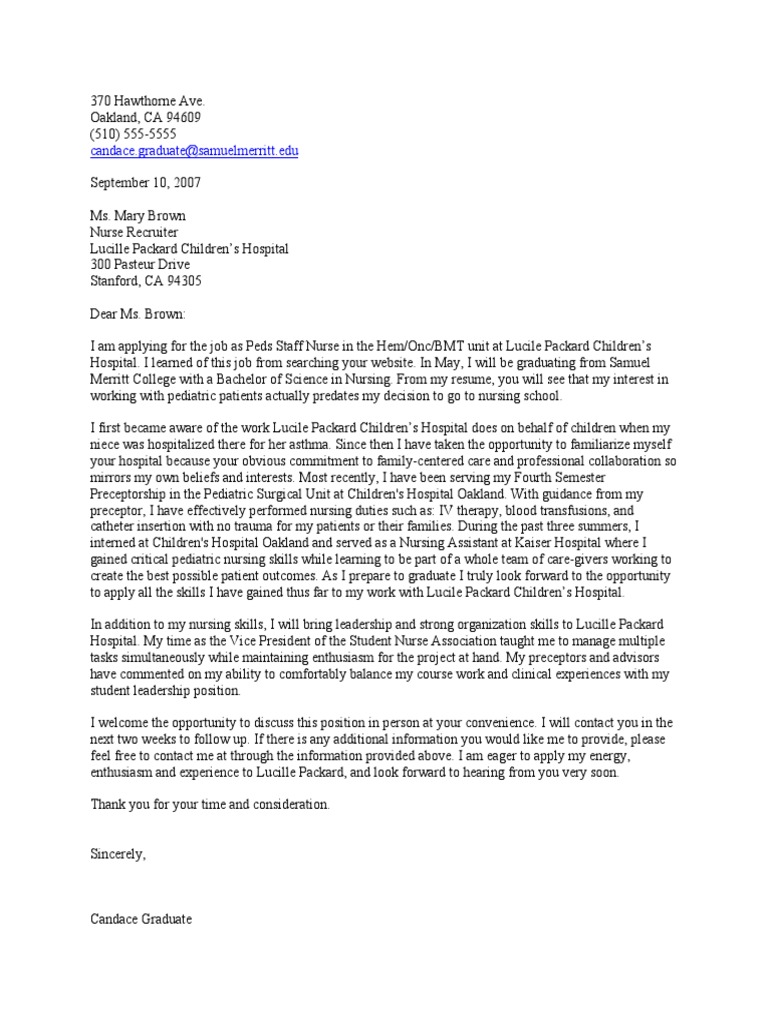 Nursing cover letter made easy. Get inspired by this cover letter sample for nursing students to learn what you should write in a cover letter and how it should be formatted for your application. Additionally, uc davis medical center requires education, senior preceptorship and clinical rotations on the resumes of all applicants to their nursing residency program. I graduated from smith college with an associate of science in nursing in may 2009, and with my bachelors of science in nursing in spring 2010. Get a leg up writing a great resume, and land a position at your first choice hospital rather than set June 19, 2014 | by the resume genius team | reviewed by mark slack, cprw. All the direction you need to showcase opportunity during your next job search! A cover letter should accompany your resume, and offer a brief summary of the job you're applying to and your qualifications. I am writing to express interest in the rn position open at your facility and ask that you please consider me for a position. How to write a nursing students cover letter that shines. When writing a cover letter, be sure to reference the requirements listed in the job description. Jun 02, 2021 · a sample cover letter for nursing students better than 9 out of 10 others. In your letter, reference your most relevant or exceptional qualifications to help employers see why you're a great fit for the role.
